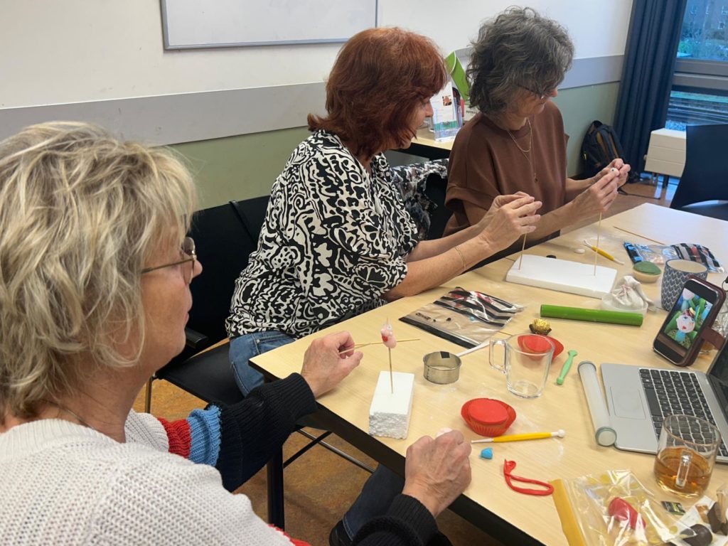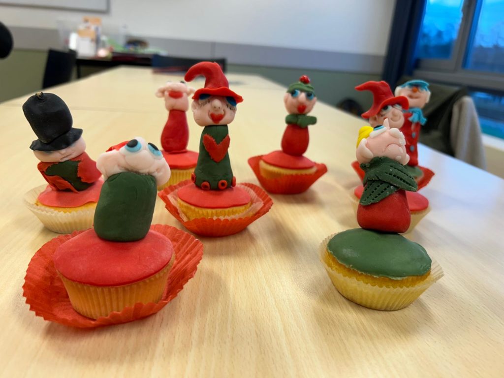 Bijzonder deze keer was dat we getrakteerd werden op warme chocolademelk, altijd lekker. H thema was deze keer: cupcakes versieren, onder leiding van Lia Bosch. (De cupcakes zelf waren al voor ons gebakken.) De versiering was bijzonder, we gingen namelijk karikatuur poppetjes voor bovenop de cupcakes maken, van fondant, in allerlei kleuren.